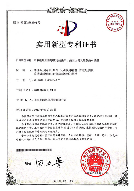 2013年單雙級壓縮順序使用的熱泵、熱泵空調及熱泵熱水機組實用新型專利證書