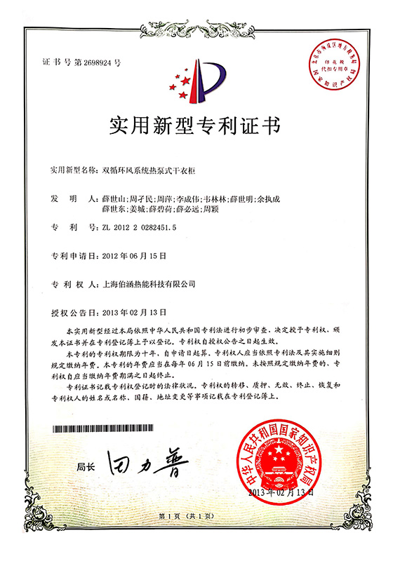 2013年雙循環風系統熱泵式干衣柜實用新型專利證書