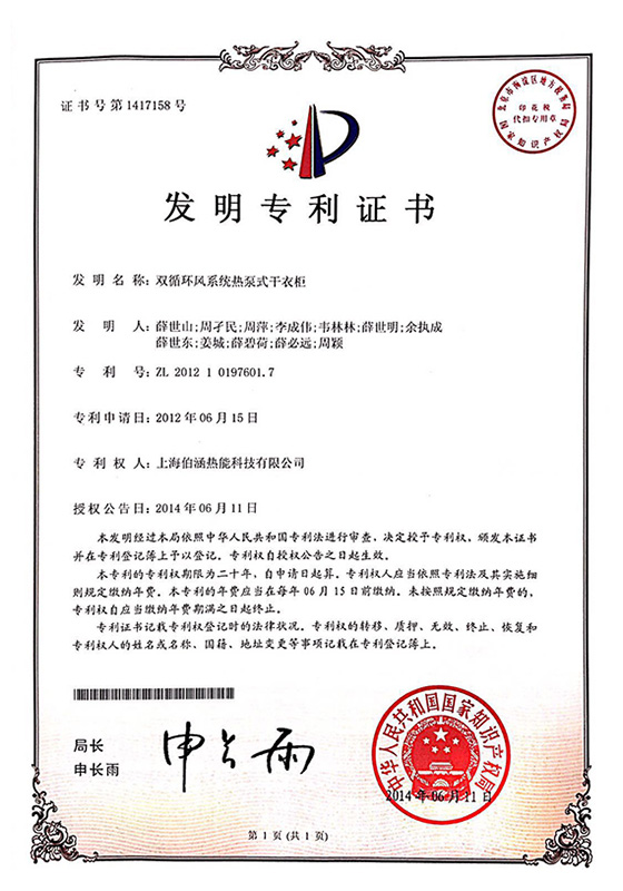 2014年雙循環風系統熱泵式干衣柜發明專利證書