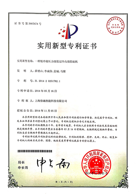 2014年一種低冷凝壓力深度過冷高效除濕機實用新型專利證書
