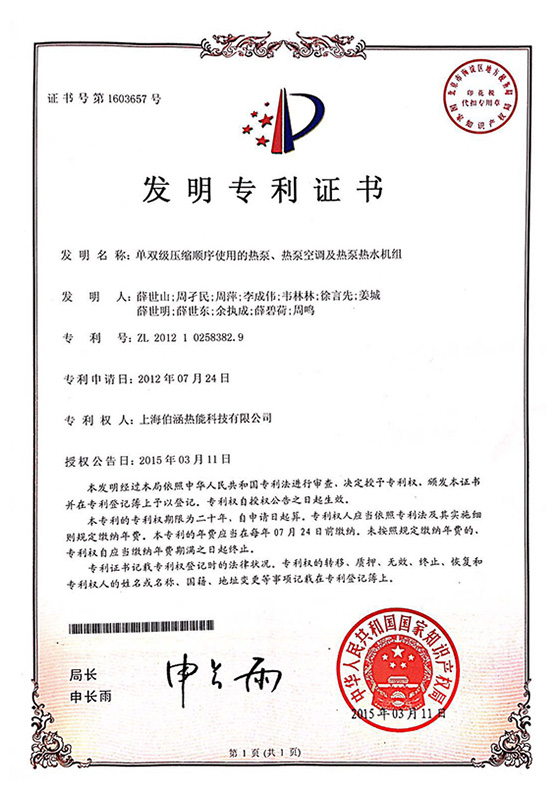 2015年單雙級壓縮順序使用的熱泵、熱泵空調及熱泵熱水機組發明專利證書