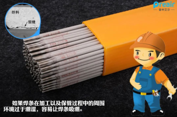如果焊條在加工以及保管過程中的周圍環境過于潮濕,容易讓焊條吸潮。已吸潮的焊條在焊接時對焊接工藝性有極其不良的影響,吸潮大時要出現滅弧。可能引起熔渣不能很好地包覆熔潭,而影響焊縫金屬的機械性能。對焊縫金屬的機械性能影響最大是塑性,這是因為焊縫金屬中溶解氫量增加的緣故。特別是低氫焊條吸潮時除上述影響外,對出現氣孔的影響更為顯著。