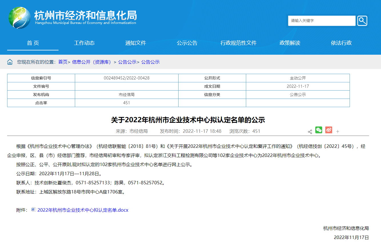 近日,杭州市經濟和信息化局發布《關于2022年杭州市企業技術中心擬認定名單的公示》,目前已結束公示期。
